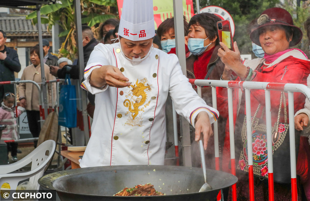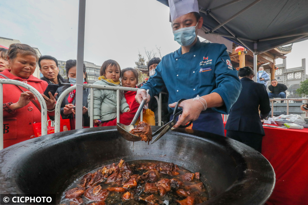↑2021年12月8日,在浙江省湖州市德清县新市古镇,厨师在烧羊肉。CICPHOTO/王树成 摄