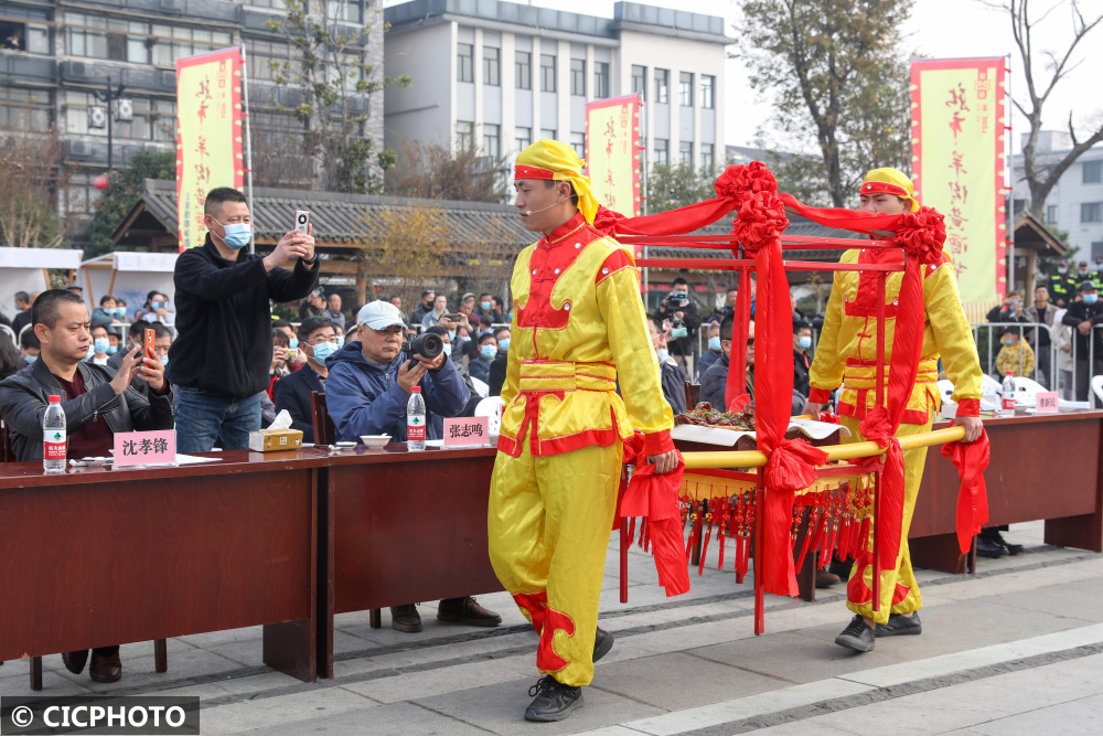 ↑2021年12月8日,在浙江省湖州市德清县新市镇羊肉黄酒节上拍摄的《羊酒荟》表演。CICPHOTO/赵宁 摄