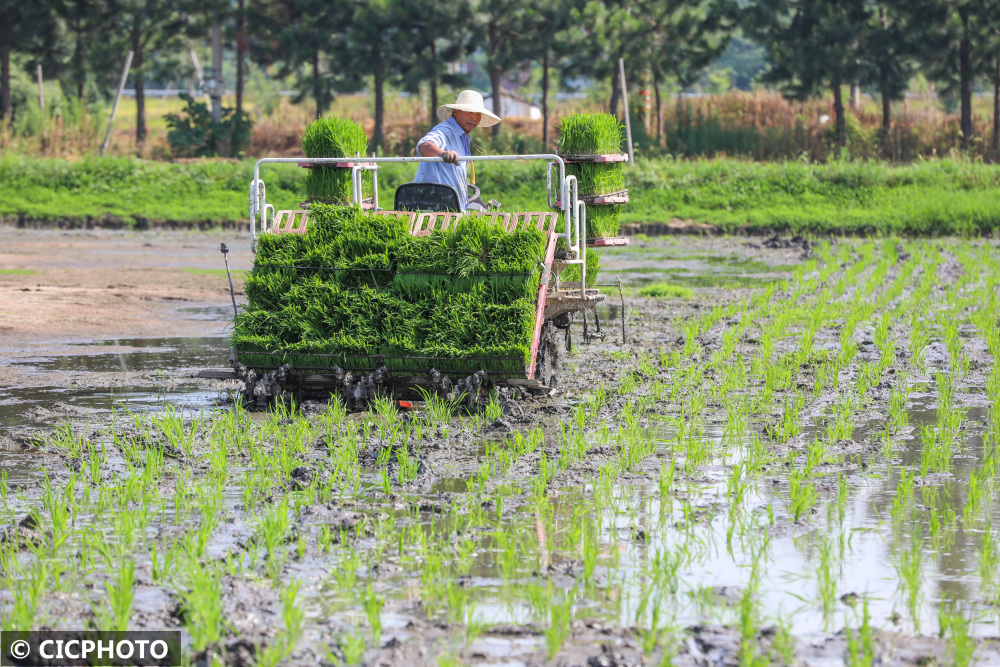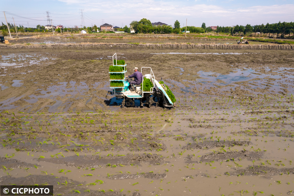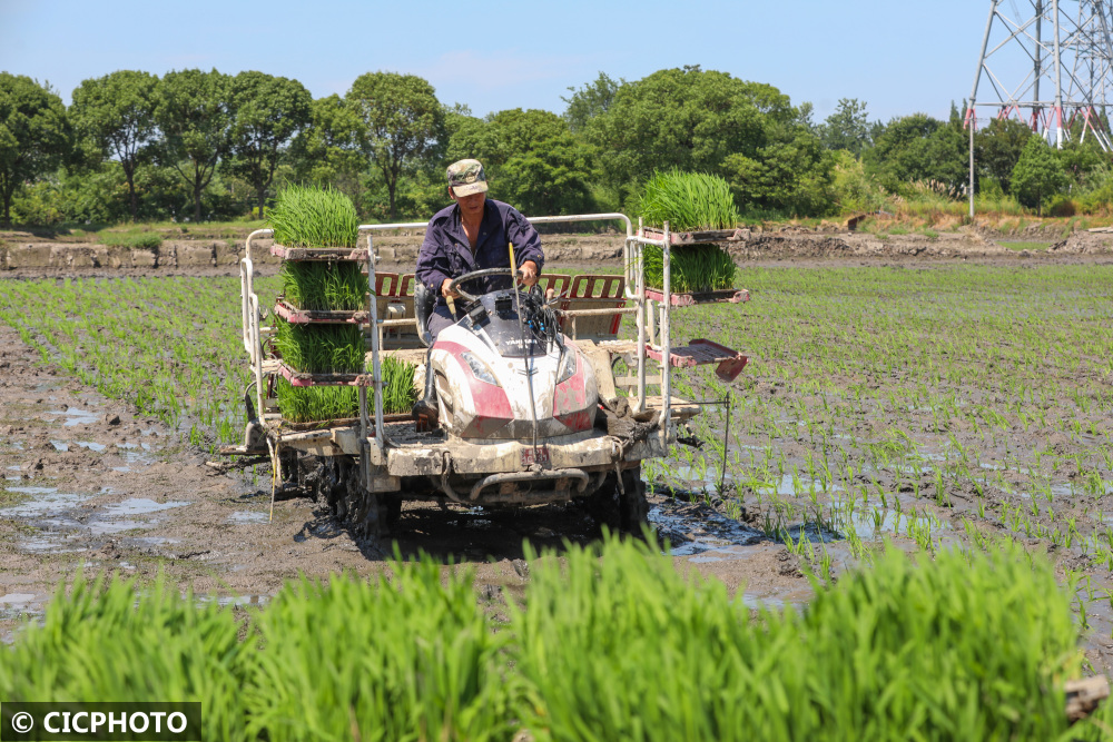 2022年6月25日,在浙江省湖州市德清县下渚湖街道朱家村的粮食生产功能区,农机手在驾驶水稻插秧机进行插秧。CICPHOTO/赵宁 摄