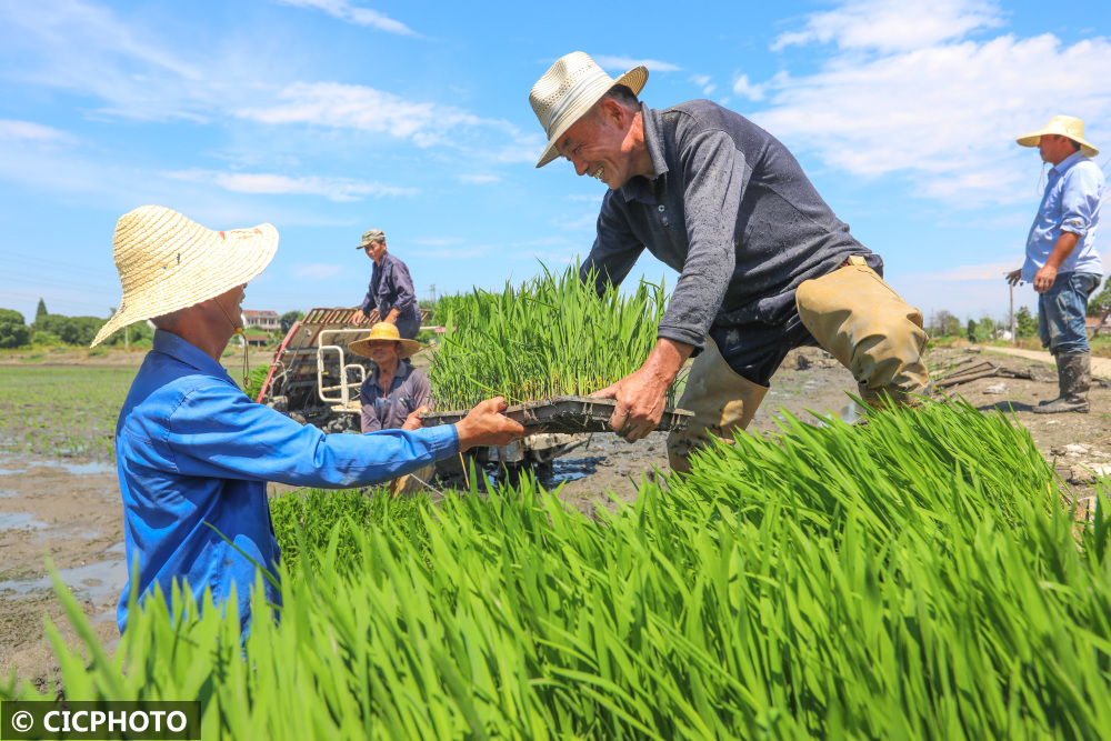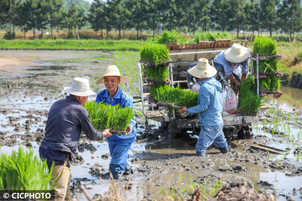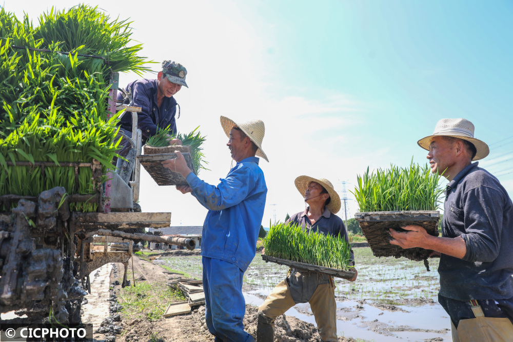 2022年6月25日,在浙江省湖州市德清县下渚湖街道朱家村的粮食生产功能区,村民们在忙着搬运秧苗。CICPHOTO/赵宁 摄