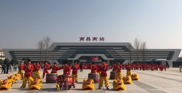 南昌南站高铁始发列车首发仪式上的舞狮表演