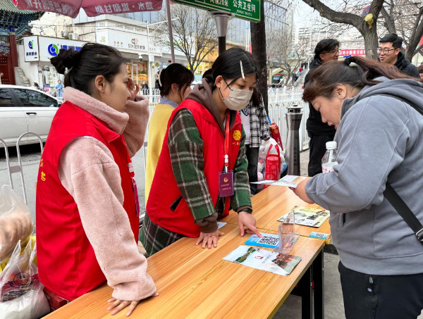 在天水市秦州区的街道一侧,志愿者为前来品尝天水麻辣烫的外地游客答疑解惑。新华社记者 文静 摄