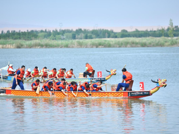 6月9日,龙舟队伍在宁夏中卫市金沙岛举办的龙舟争霸赛上竞渡。新华社发