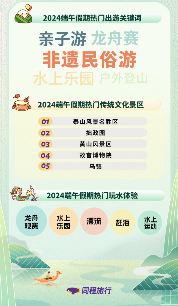据了解,广东、湖南、浙江、贵州、云南等地举办龙舟竞渡。湖北武汉推出“漫游武汉”系列文化和旅游活动。河南通过非遗展演、端午习俗等沉浸式场景让游客感受传统文化魅力。安徽推出花戏楼里的情景剧、沉浸式微空间体验剧等产品。江苏举办“水韵江苏·乐购非遗”活动。各地还将传统民俗、民间艺术有机融入博物馆、美术馆、图书馆、戏剧场、电影院等文化空间,丰富了文旅深入融合的新场景。根据同程旅行数据显示,非遗民俗游、亲子游、龙舟观赛、水上乐园和户外登山是端午假期最热门的出游主题。