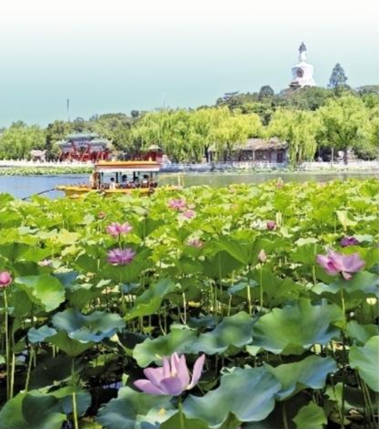 图为近日北京北海公园荷花盛开,吸引游客乘船赏荷。 龚文豹 摄