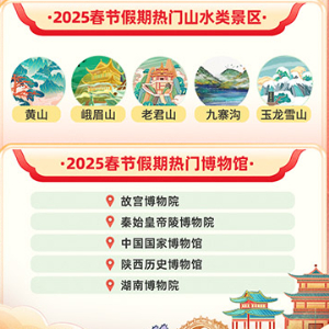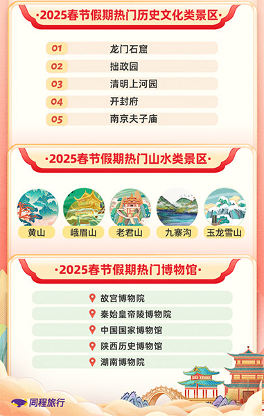 历史文化、自然山水、动物园、博物馆等是春节假期预订热度最高的景区主题。其中,历史文化类景区和博物馆类景区旅游热度同比增长超过50%。洛阳的龙门石窟,苏州的拙政园和开封清明上河园成为春节热门历史文化类景区。