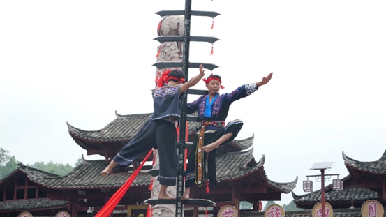 松桃民族文化以苗打底,古朴神奇。苗家先民刀耕火种、男作女织沉淀出“苗系列”文化精华,蕴养非遗名录近200项。“上刀梯”“下火海”等苗族绝技绝艺惊心动魄,传承人唐羽荟六破世界吉尼斯记录,其团队表演的《飞龙刀技》刚获第十二届全国少数民族传统体育运动会绝技类一等奖。苗族傩戏被誉为戏剧“活化石”,花鼓舞声名远扬。寨英滚龙气势恢宏,被国家体育总局列入中华体育文化优秀节庆项目。苗医苗药神妙绝奇,远近闻名。苗家绣娘以针为笔,绘就“世界名画”。苗王城景区是“苗系列”的集中展示地和沉浸体验场,正在举办的《松桃村晚》则为“苗系列”注入新活力。