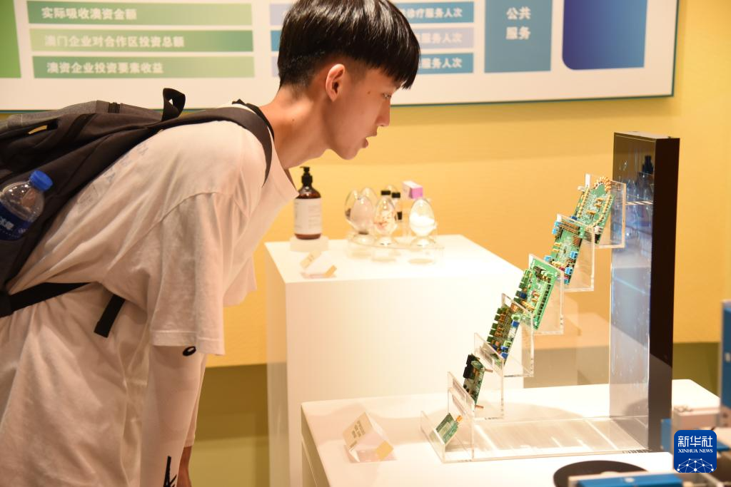7月5日上午,来自台湾桃园市的王同学在横琴粤澳深度合作区规划展览馆查看电路板展品。新华社记者 洪泽华 摄