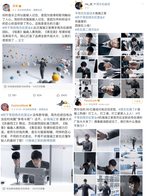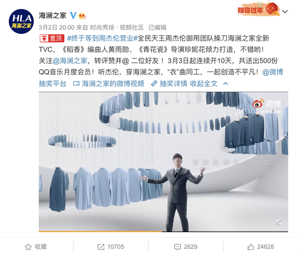 海澜之家一贯对代言人真是宠溺到家。这支由杰伦亲手打造的视频大片直接送上央视黄金时间段首发。甚至让人怀疑,今年周杰伦压轴出场上春晚云表演,不会也是春晚独家服装合作伙伴海澜之家的手笔吧?