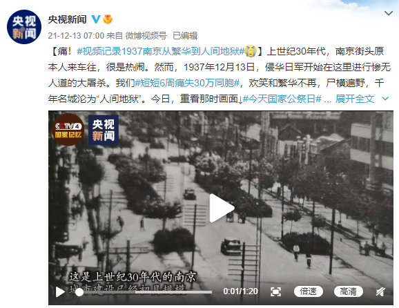 【痛!视频记录1937南京从繁华到人间地狱】上世纪30年代,南京街头原本人来车往,很是热闹。然而,1937年12月13日,侵华日军开始在这里进行惨无人道的大屠杀。我们短短6周痛失30万同胞,欢笑和繁华不再,尸横遍野,千年名城沦为“人间地狱”。今日,重看那时画面。