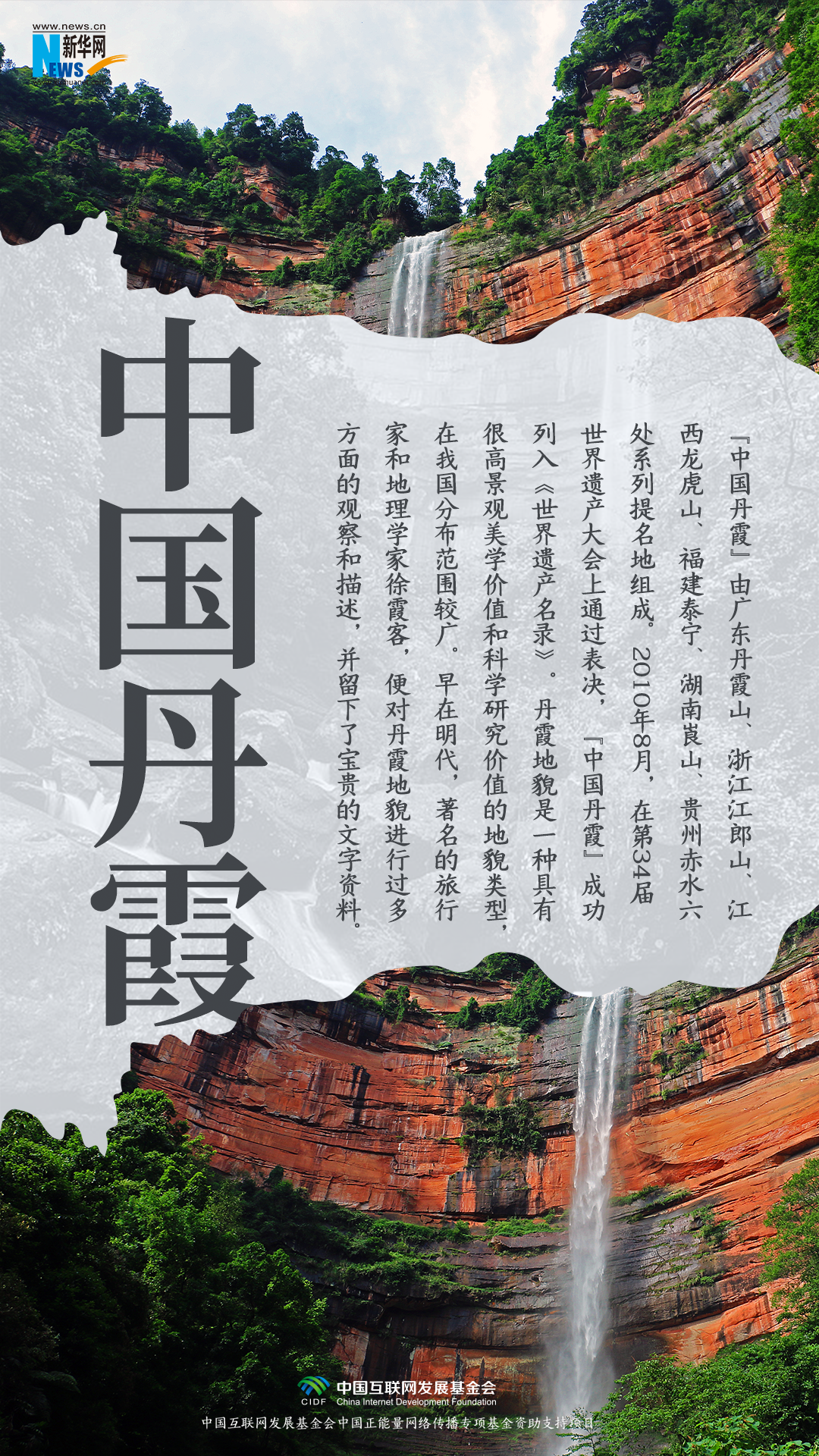 “中国丹霞”由广东丹霞山、浙江江郎山、江西龙虎山、福建泰宁、湖南崀山、贵州赤水六处系列提名地组成。2010年8月,在第34届世界遗产大会上通过表决,“中国丹霞”成功列入《世界遗产名录》。丹霞地貌是一种具有很高景观美学价值和科学研究价值的地貌类型,在我国分布范围较广。早在明代,著名的旅行家和地理学家徐霞客,便对丹霞地貌进行过多方面的观察和描述,并留下了宝贵的文字资料。