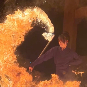 民间绝技火壶表演,表演者需身着防火服,将烧好的木炭放入两侧的铁网,通过抖动产生火花。热烈的火光与壶影相映成趣,呈现出如同“火树银花”般的效果,寓意“驱疾避祸,百家安宁”。