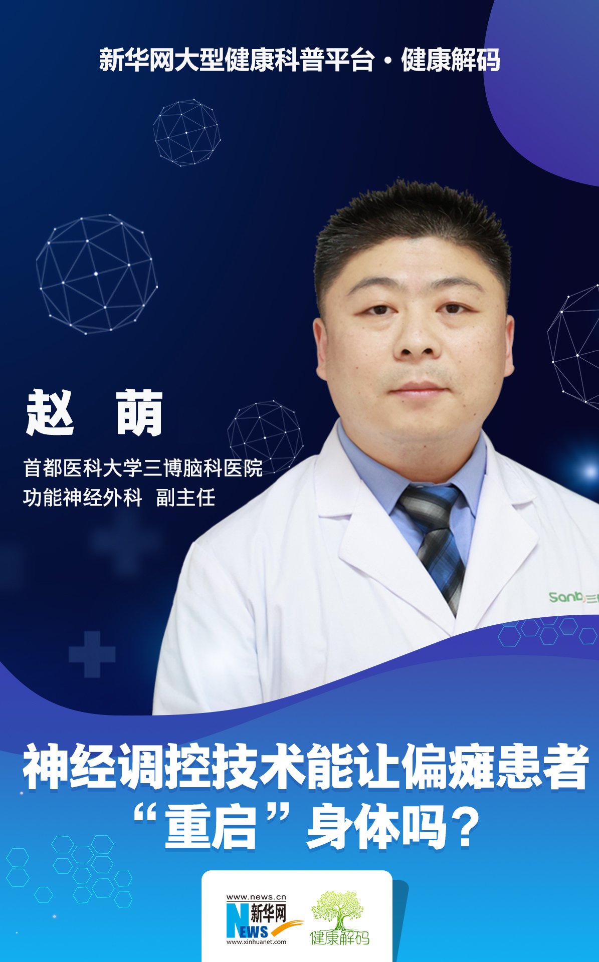 首都医科大学三博脑科医院功能神经外科副主任、河南三博脑科医院功能神经外科主任、副主任医师赵萌做客新华网《健康解码》栏目
