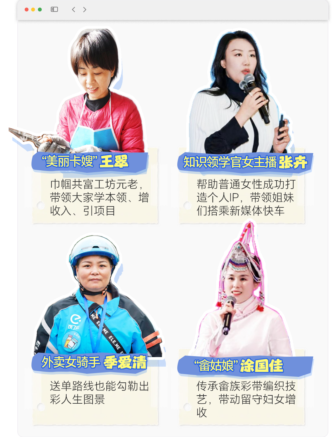 “谁说家庭主妇不能当‘创富领头雁’?”“美丽卡嫂”王翠宣讲她从家庭主妇蜕变为巾帼共富工坊元老,带领大家学本领、增收入、引项目的经历,用行动诠释“妇女能顶半边天”;女主播张卉娓娓道来,如何从传统媒体人转型为抖音知识领学官,培育众多普通女性成功打造个人IP,带领姐妹们搭乘新媒体快车;外卖女骑手季爱清用自己九年拼搏“骑”进全省“最美外卖骑手”的故事,描绘送单路线也能勾勒出彩人生的图景;“畲姑娘”涂国佳以手中线和梭誓把畲族彩带编织技艺传承下去,带动留守妇女增收,在家乡闪闪发光……