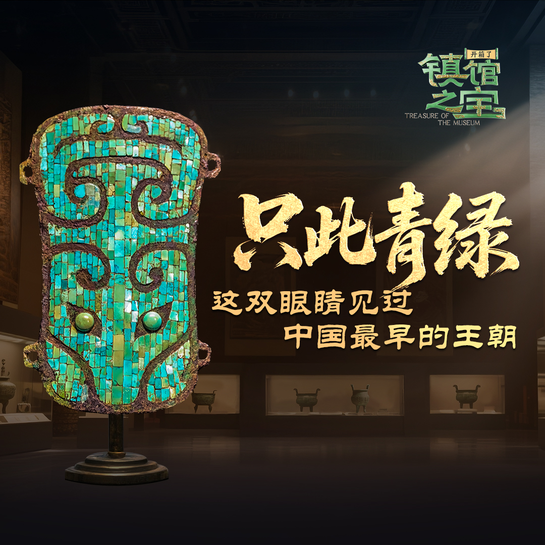 以青铜为底,装饰兽面纹,纹饰之间镶嵌数百片细小的绿松石片,历经3600年不脱落,只此青绿,开启了一个金玉共振的璀璨时代。