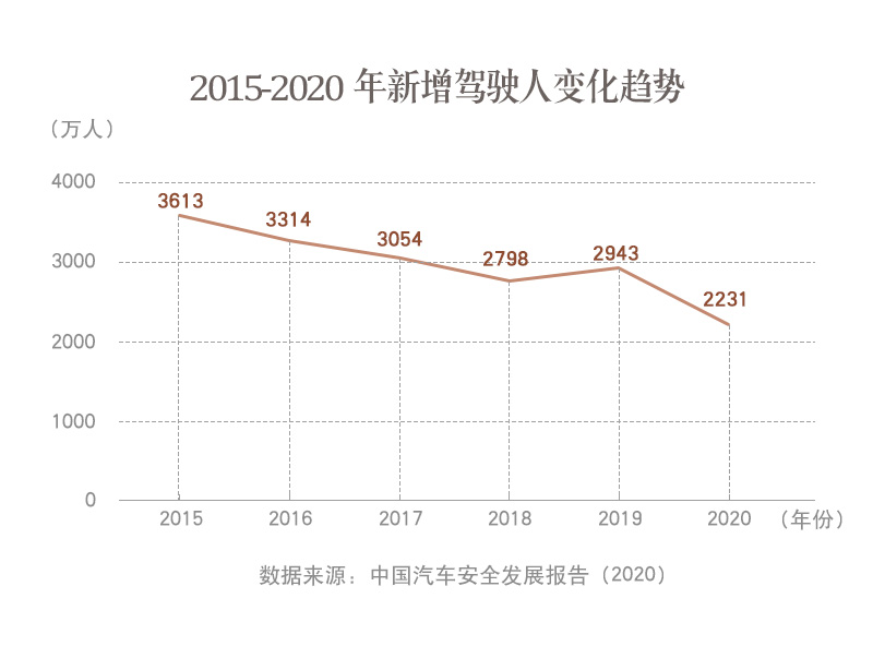 尽管中国驾驶人数量持续攀升,但增幅在放缓,从近几年数据来看,每年新增驾驶人数量由2015年的3613万人开始逐年减少,总体呈下降态势。
