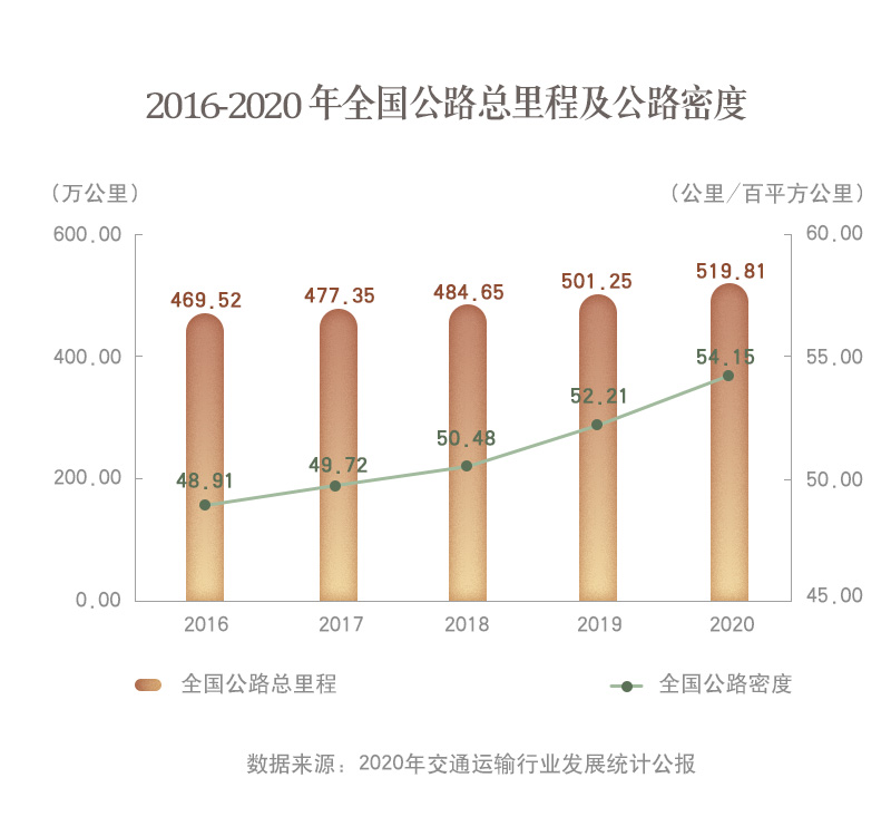 截止到2020年全国公路总里程519.81公里,比上年末增加18.56万公里。公路密度54.15公里/百平方公里,增加1.94公里/百平方公里。公路密度的不断攀升,也意味着随着交通愈加便捷的同时,道路交通安全需要大家更加关注。