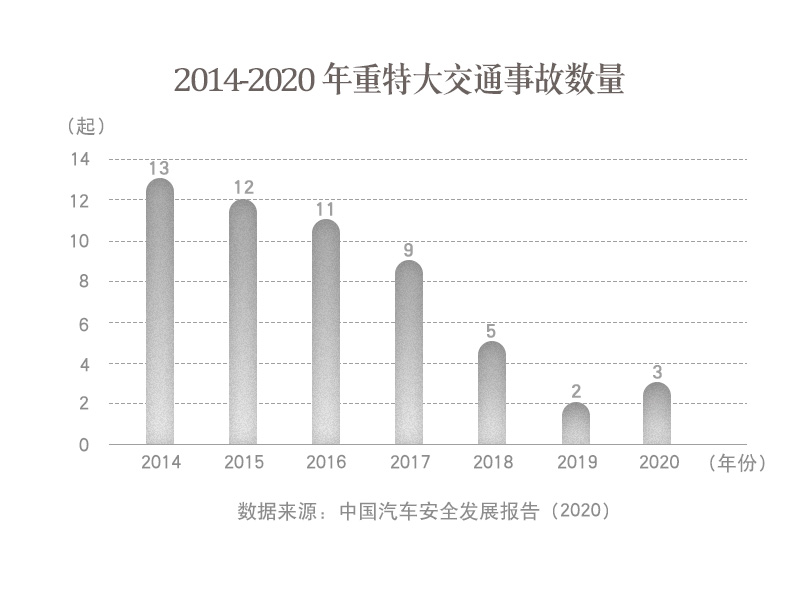我国道路交通事故总量稳中有降,重特大事故由2014年的13起降至2020年的3起。