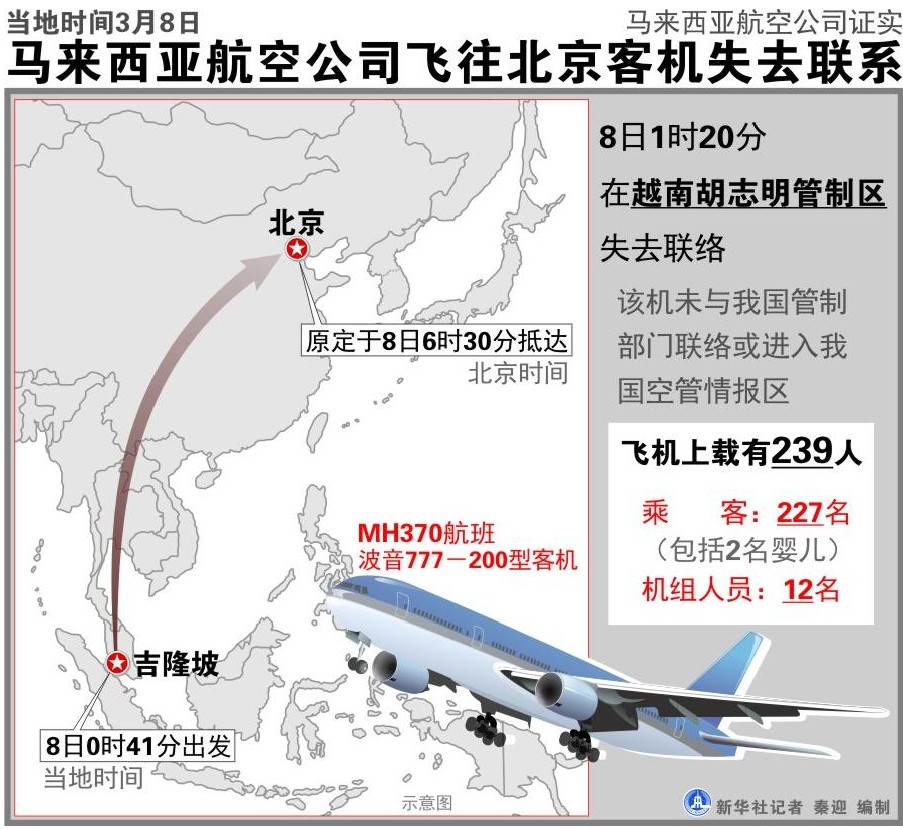 2014年3月8日 图表:马来西亚航空公司飞往北京客机失去联系 新华社记者 秦迎 编制