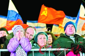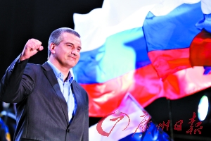 16日,克里米亚领导人阿克肖诺夫与广场上群众一同庆祝独立。