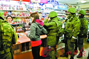 16日,克里米亚某小镇,蒙面的武装士兵和当地居民在超市购物。