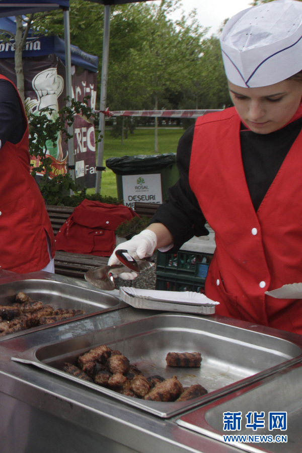 5月1日,罗马尼亚首都布加勒斯特,一名工作人员在把传统烤肉肠“糜奇”装盘。今年“五一”4天假期,布加勒斯特一些街区组织各种活动吸引市民,其中包括免费品尝“糜奇”肉肠。“糜奇”是一种用猪、牛肉馅等加上特殊调料配制而成的烤肉肠,每个重量从50克到100克不等,被认为是该国最具特色的传统美味,也是全国男女老少人皆喜欢的食物。(新华社/佩特雷斯库摄)