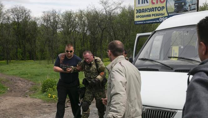 据外媒报道,当地时间5月5日,乌克兰军队在斯拉维扬斯克郊区与亲俄武装人员爆发激烈冲突。图为亲俄武装人员受伤后,被带离冲突区域。