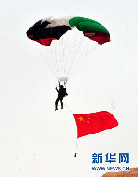 5月5日,在约旦首都安曼阿卜杜拉国王特战训练中心,一名中国参赛队员携五星红旗跳伞着陆。新华社记者蒋少清摄