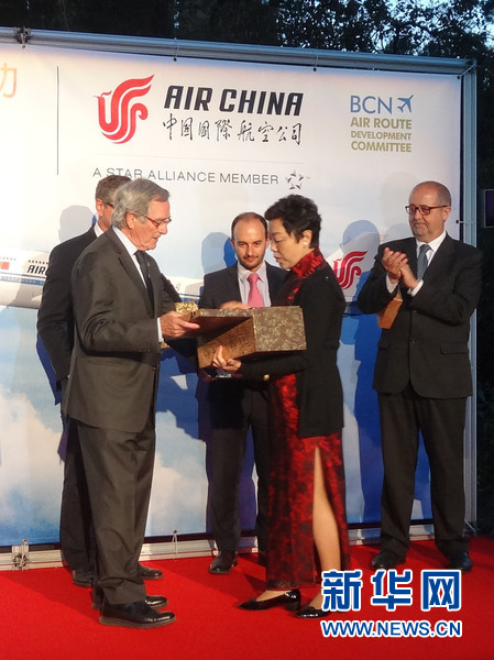 5月5日晚间,在国航为北京至巴塞罗那航线开通举办的庆祝活动上,国航党委副书记冯润娥向巴塞罗那市市长哈维尔·特利亚斯赠送纪念品。