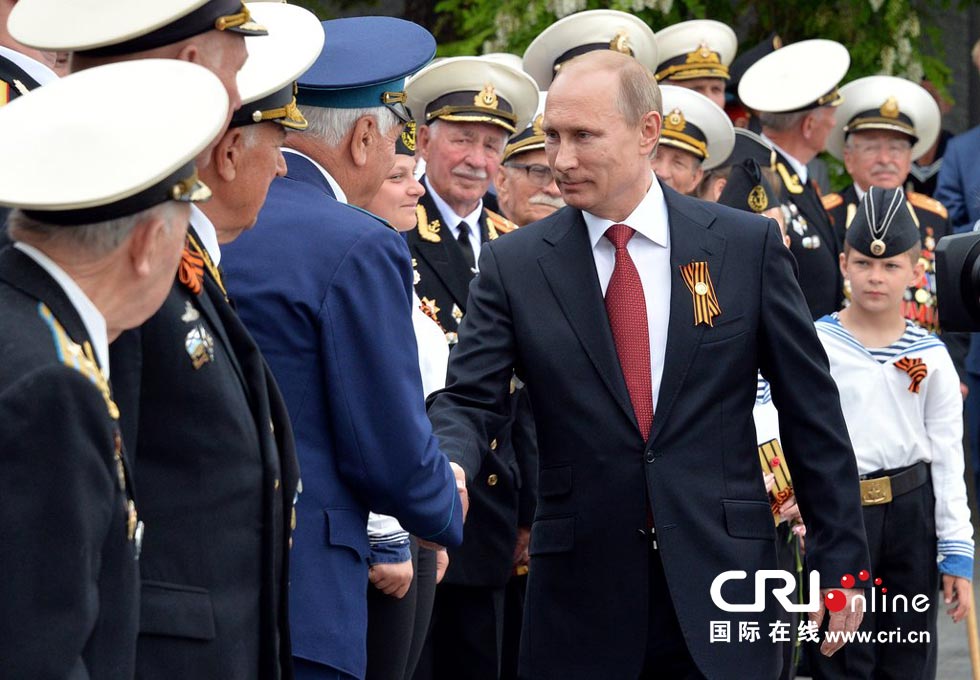 俄罗斯总统普京9日上午在莫斯科红场出席卫国战争胜利69周年阅兵式后,立即飞抵克里米亚联邦区,午后到达塞瓦斯托波尔军港,乘军舰观看胜利日海军空军阅兵式,并发表演说。这是克里米亚加入俄联邦后,总统普京的首次到访。图片来源:YURI KADOBNOV/CFP
