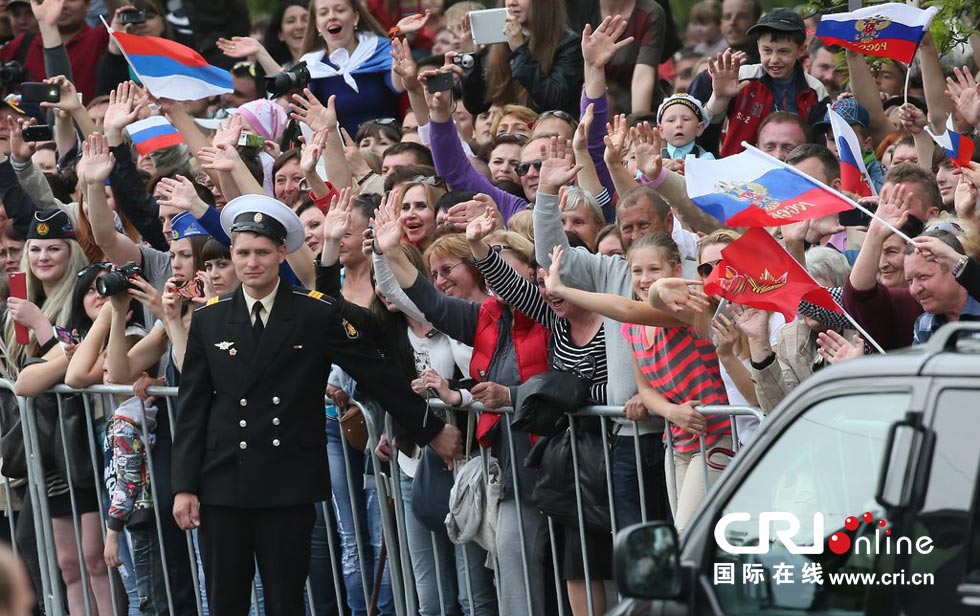 俄罗斯总统普京9日上午在莫斯科红场出席卫国战争胜利69周年阅兵式后,立即飞抵克里米亚联邦区,午后到达塞瓦斯托波尔军港,乘军舰观看胜利日海军空军阅兵式,并发表演说。这是克里米亚加入俄联邦后,总统普京的首次到访。图片来源:YURI KADOBNOV/CFP