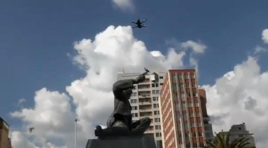 这架小型无人机拥有四个螺旋桨,可持续飞行20分钟,最快时速达69公里,最高飞行高度约1931米。