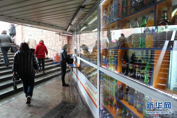 5月12日,市民在乌克兰顿涅茨克一地下通道购买食品。 12日一早,乌克兰顿涅茨克州府顿涅茨克市下着中雨。这里没有受到前一天关于本州地位问题公投的影响,人们照常出行上班,银行商店照常开门迎客,居民生活秩序井然。乌克兰东部顿涅茨克州和卢甘斯克州的民间武装今年4月初分别成立了“人民共和国”,并在5月11日分别就本州地位问题举行了地方性公投。新华社记者鲁金博摄 >>>点击详细