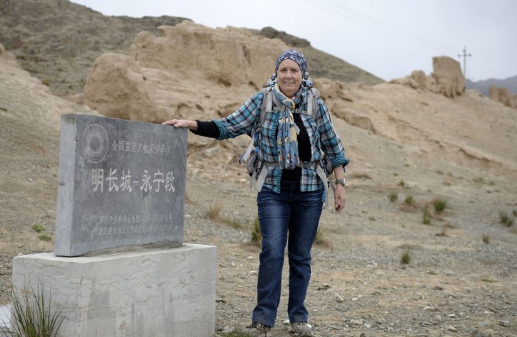 5月10日,69岁的澳大利亚籍法国人西尔维亚来到宁夏三关口明长城,沿着长城脚下徒步5个多小时,往返20多公里,边走边察看被损毁的长城城墙,并不时告诉身边陪同的“驴友”保护长城的意义。新华社记者 王鹏 摄