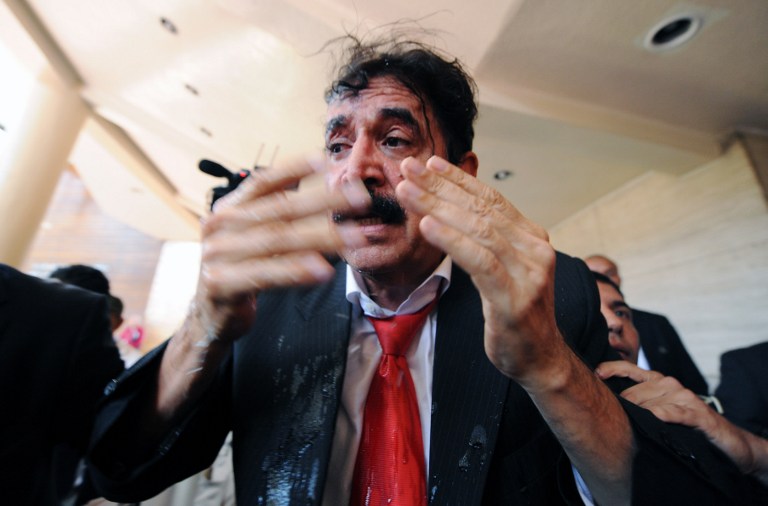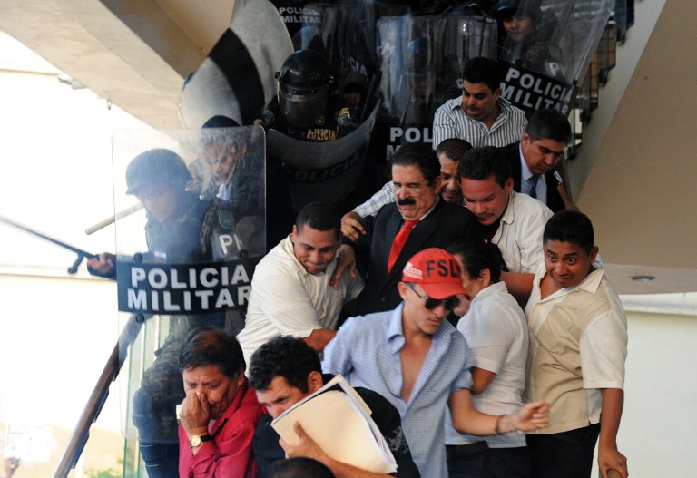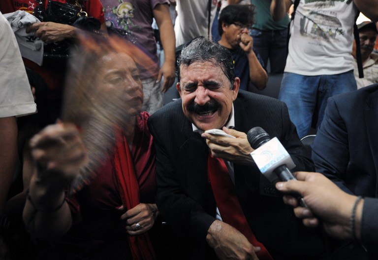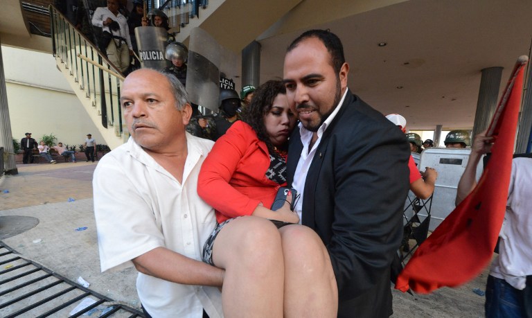 一名女议员受到催泪弹伤害,被抱出国会大楼。5月13日,洪都拉斯国会议员、前总统曼努埃尔 塞拉亚及夫人与其政党Libertad y Refundacion在国会大楼前抗议时遭催泪弹驱逐。抗议者向政府要求发言权,与防暴警察发生冲突。