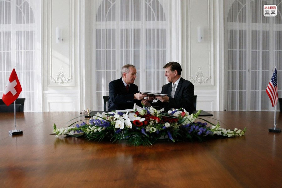 真正意义上的突破是美国2010年通过的《海外账户纳税法案》(FATCA),其中详细规定了打击避税的跨国合作方案,法案要求境外金融机构自动向美国汇报资产在5万美金以上的美国公民信息,不配合的金融机构将面临被踢出美国金融市场的惩罚。2013年2月14日,美国财政部宣布,美国与瑞士已达成合作协议,根据协议,瑞士金融机构将披露美国账户持有人的更多信息,以帮助打击离岸逃税。图为瑞士财务部长Michael Ambuehl(左)和美国驻瑞大使Donald Sternoff Beyer签署协议。 Pascal Lauener/Reuters