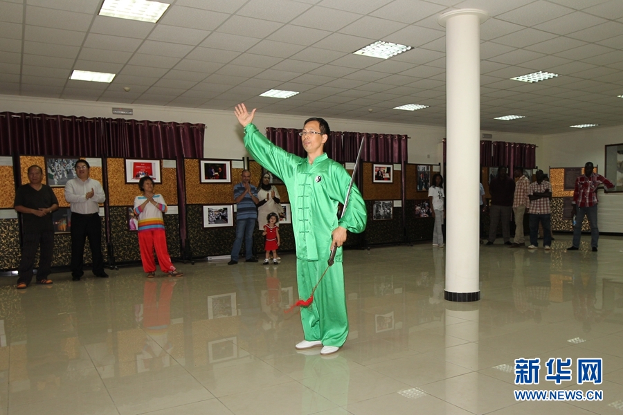 在尼日利亚中国文化中心多功能厅,国家汉办公派教师、阿布贾首都教育资源中心杨峰在表演42式太极剑。新华社记者 程光明摄