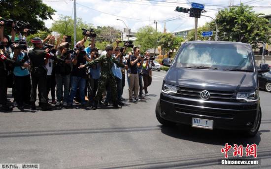 当地时间5月23日,泰国曼谷,泰国军方当传唤遭解散的看守政府内阁和执政党领导人,要求他们向军方宣布政变后成立的“全国维持和平秩序委员会”进行报告,包括此前遭解职的前看守总理英拉。图为被认为载有英拉的车辆驶入陆军俱乐部。