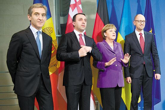 默克尔28日在柏林会见乌克兰代总理亚采纽克(右)、格鲁吉亚总理加里巴什维利(左2)和摩尔多瓦总理尤里·良格(左),举手投足之间尽显“御姐范”