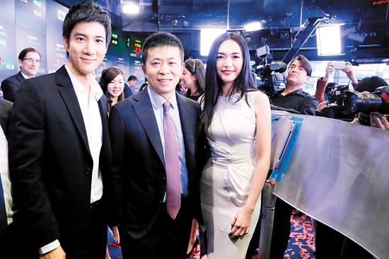 姚晨4月17日在纽约出席新浪微博的上市活动,与曹国伟(中)、王力宏(左)在仪式现场合影,成为首位完整陪伴了微博上市孕育过程的明星代表