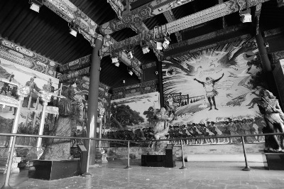 工作人员带着记者来到“日军中尉”摆拍照片的显佑殿,虽经多次改造,但是还可以看出殿内轮廓。在显佑殿后方,照片中的槐树仍然郁郁葱葱,历经70年,槐树已经粗得两个人抱不过来。