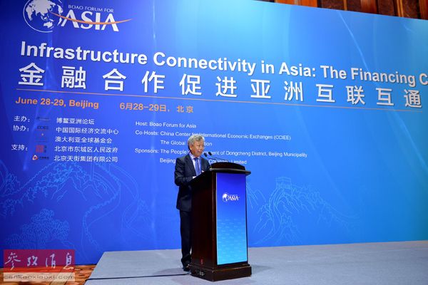 6月29日,中国国际金融有限公司董事长、财政部亚洲基础设施投资银行筹备组组长金立群在开幕式上做主题演讲。新华社记者 李鑫 摄