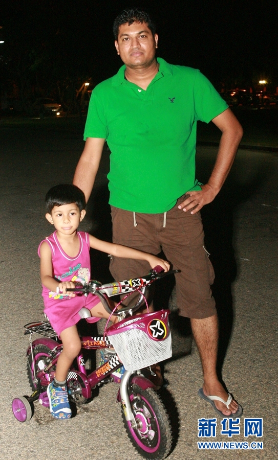 科伦坡独立广场,一名带着孩子在散步的男子向记者摆POS。新华网记者 黄海敏摄