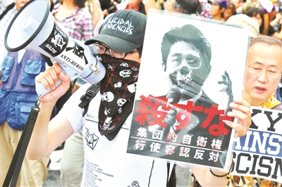 5日,日本东京,示威者恶搞安倍肖像,抗议重新解释和平宪法 供图/CFP