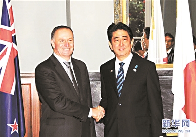7日,新西兰总理约翰·基(左)会见安倍 新华社发