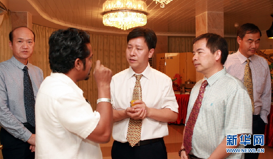 马尔代夫太阳媒体集团代表与新华社亚太总分社营销总经理兼亚太日报副社长温新年(前右二)交谈。新华网记者黄海敏摄