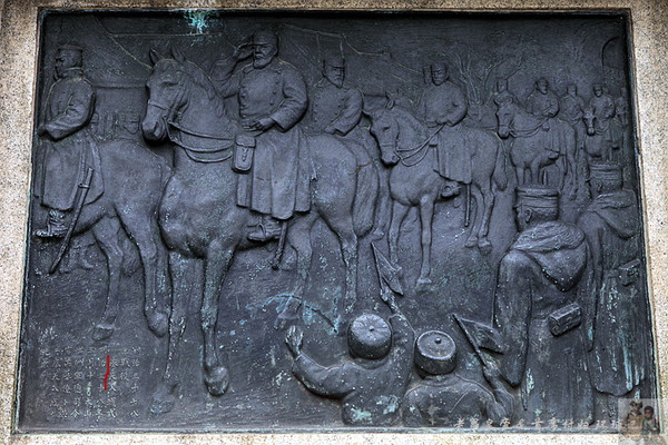 靖国神社大门两侧各有一座纪念碑,碑底座有浮雕,一边描绘的是中日甲午海战,另一边是抗日战争时期日军入侵上海。都是从正面描绘当时日本军队如何“英勇”作战,是不折不扣美化当年侵略战争的做法。