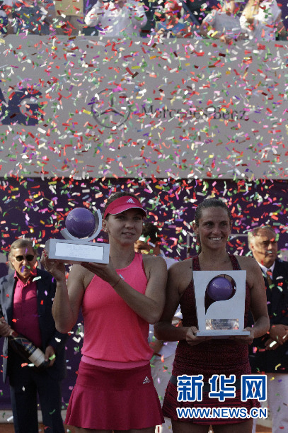 WTA布加勒斯特网球公开赛单打冠军西蒙娜·哈勒普(左)与亚军、意大利老将罗伯塔·芬奇捧着冠、亚军的奖杯。新华社佩特雷斯库 摄