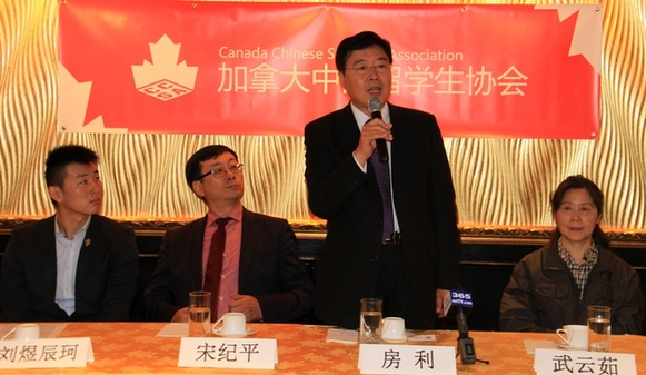 7月15日,中国驻多伦多总领事房利在加拿大中国留学生协会成立仪式上讲话。新华网记者 晏忠华 摄