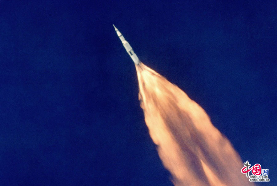 美国空军EC-135N飞机拍摄到的阿波罗11号升空画面。